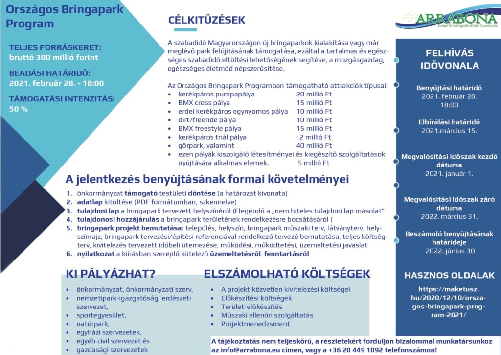 A Magyar Kerékpáros Turisztikai Szövetség (MAKETUSZ) koordinálásával a bringapark program keretein belül pumpapálya, BMX cross, triál, dirt, erdei single trail pálya, BMX freestyle és görpark megvalósítására lehet jelentkezni. A bringaparkok megépítésére 50%-os önrész vállalásával lesz lehetősége a jelentkezőknek, akik a teljesség igénye nélkül lehetnek önkormányzatok, önkormányzati szervek, sportegyesületek és egyéb civil szervezetek. A programokba 2021. […]